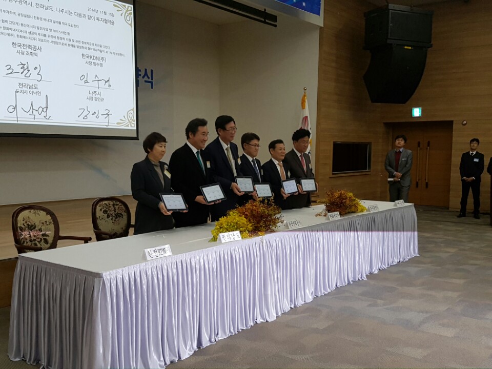 11월 15일 전라남도와 한국전력공사, 공주시, 나주시, 그리고 한화에너지 등 총 44개 기업이 1,628 억 원 규모의 에너지밸리 투자협약을 체결했습니다. 이에 따른 고용 창출 규모는 1,128 명입니다.