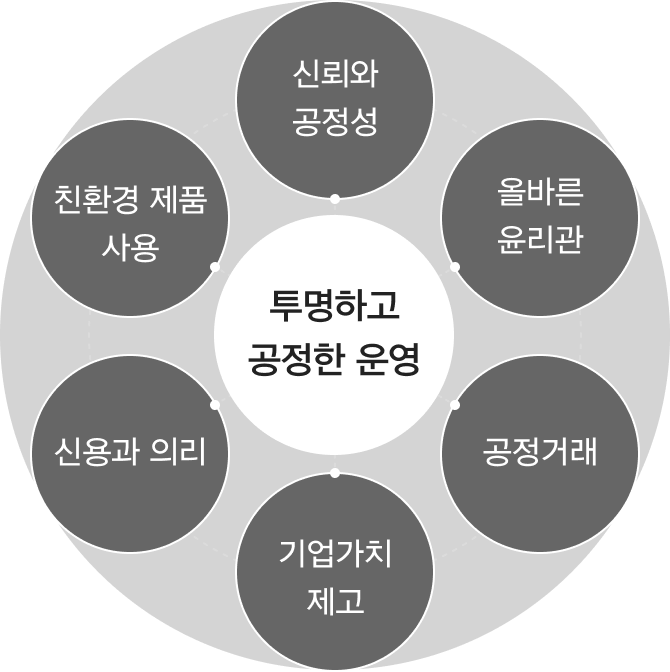 신의와 공정성을 기업 경영의 제일 덕목으로 삼고 경제활동을 비롯한 모든 사회활동에서 법규와 사회규범을 준수하며,